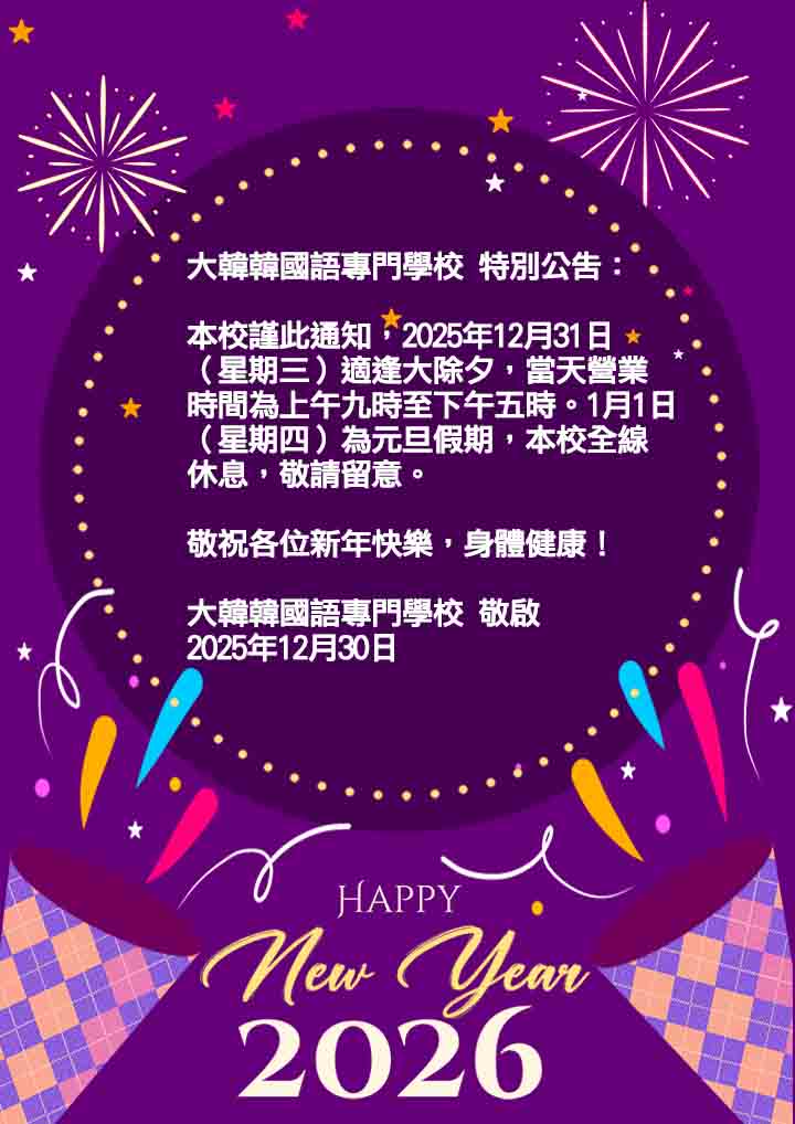 大韓韓國語專門學校 敬啟 2025年12月30日